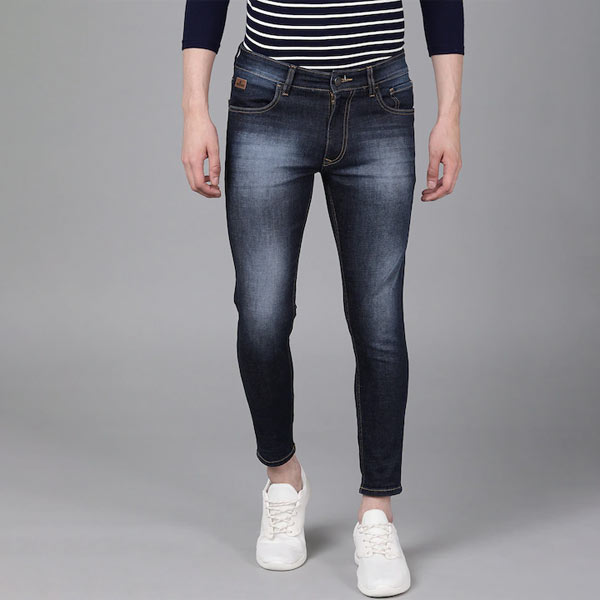 Blue dark wash 5-pocket mid-rise jeans, clean look, heavy fade, has a button and zip closure, and waistband with belt loops